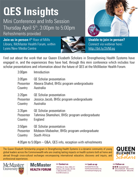 Find out about the work that our Queen Elizabeth Scholars in Strengthening Health Systems have engaged in, and the experiences they have had, through this mini conference which includes four scholar presentations and information about the future of QES at the McMaster Health Forum.