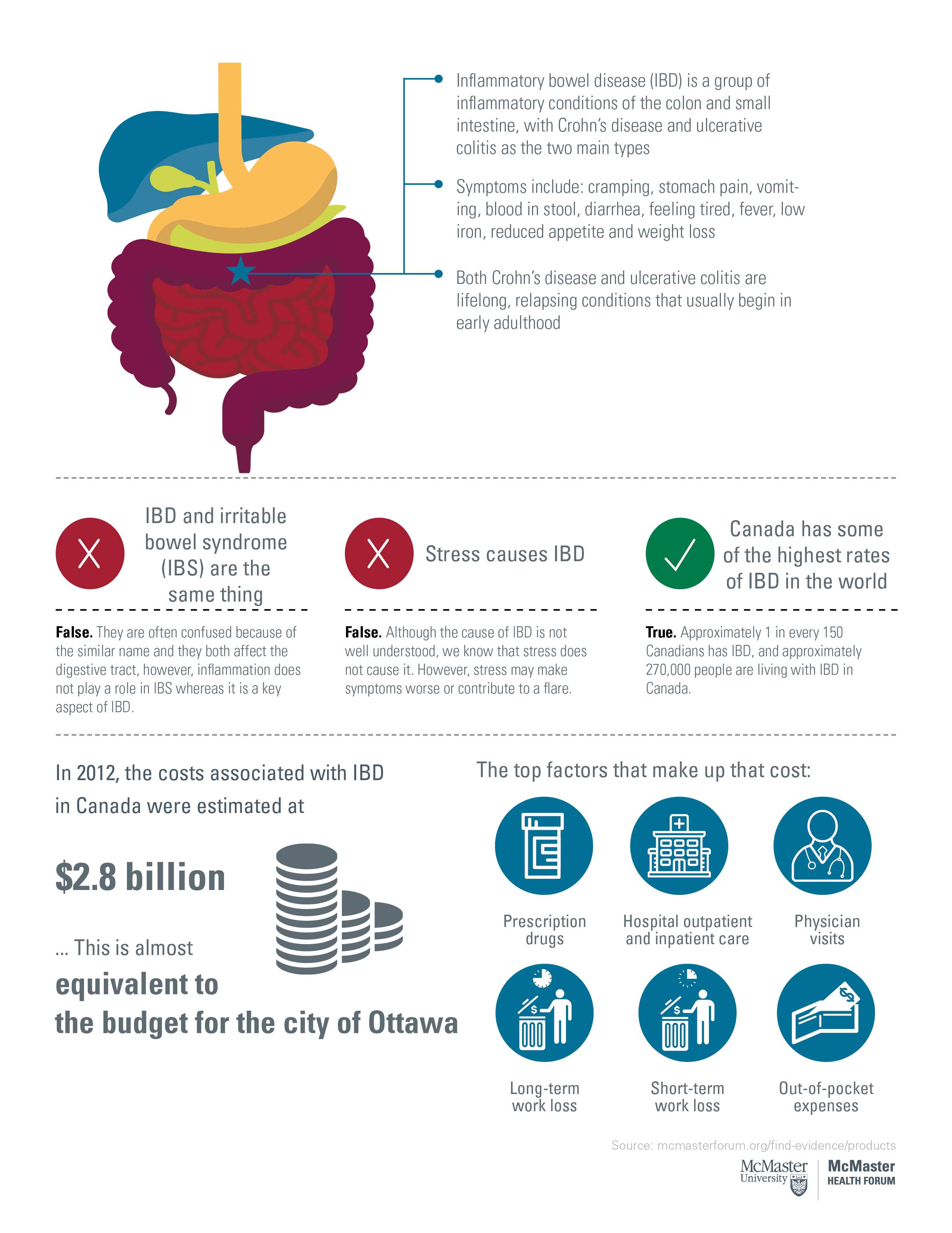 This specific topic was prioritized by members of the IMAGINE Network and the McMaster Health Forum, presenting an issue that can act as a powerful exemplar for government policymakers to consider how to systematically deal with issues pertaining to complex single conditions, instead of a one-size-fits-all approach to chronic-disease management. Specifically, in determining how to ensure appropriate, cost-effective services for IBD are available to those who need them, policymakers will have the tools to think through how they can establish nimble health systems that are positioned to develop a range of condition-specific responses when necessary.
