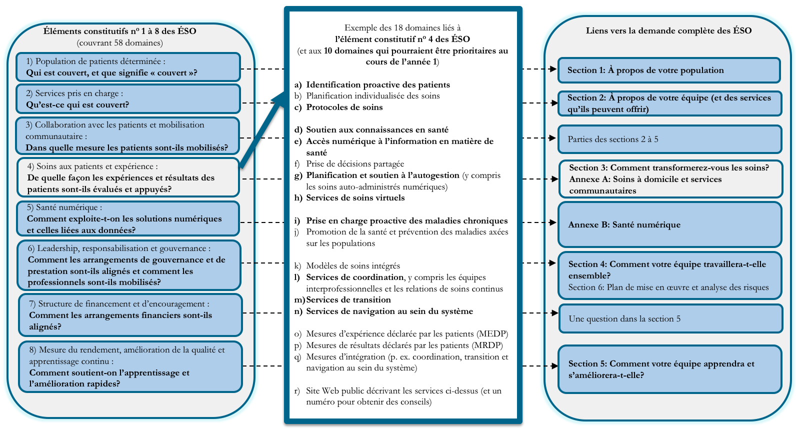 Figure : Éléments constitutifs des ÉSO, domaines connexes et liens vers le formulaire de demande complet pour les ÉSO (cliquez pour agrandir)