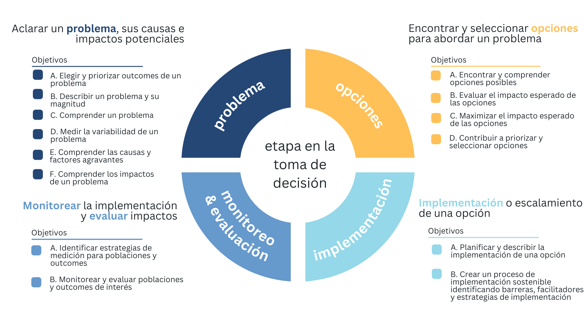 Cada etapa de toma de decisiones incluye diferentes objetivos a alcanzar (14 en total), y cada objetivo incluye múltiples tipos de preguntas que pueden abordarse (42 en total).
