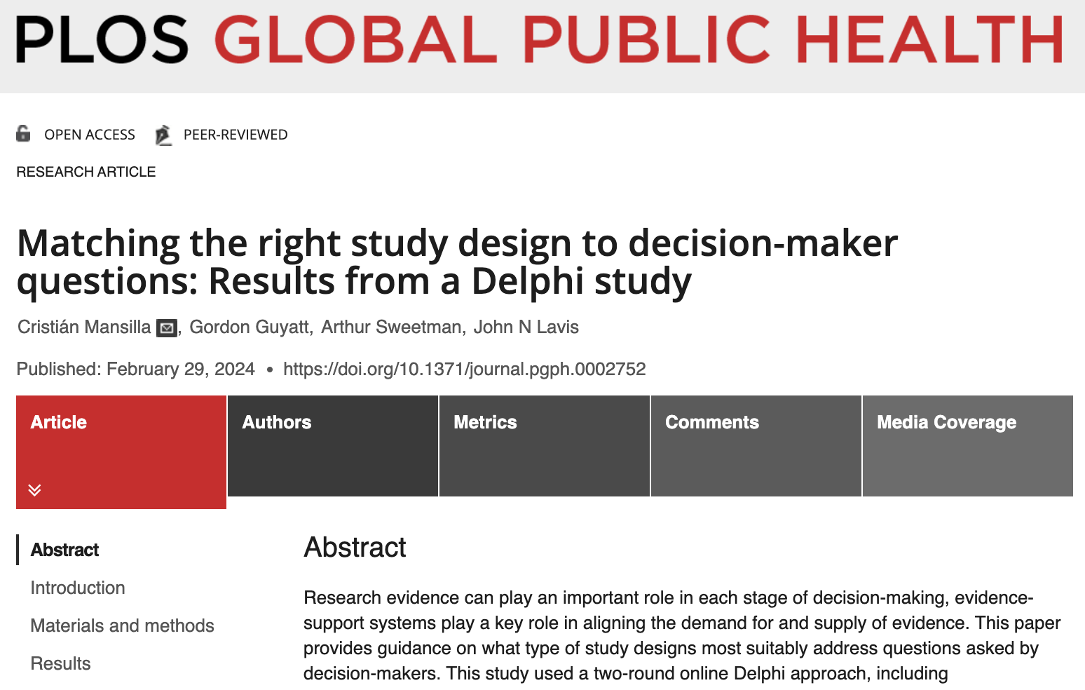 Se realizó un estudio transversal incluyendo a todas las unidades a nivel global que entregan algún tipo de evidencia en respuesta a una solicitud explícita de tomadores de decisión. Este estudio solicitó a estas unidades que proporcionaran las preguntas o los outputs que habían generado en respuesta a estas preguntas.