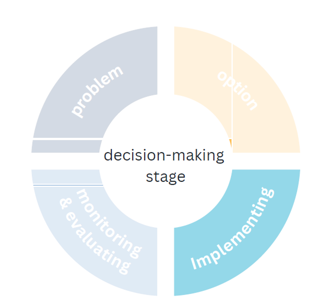 The implementation process entails identifying strategies to ensure a sustainable implementation of an option. Implementation strategies can take the form of interventions to address or take advantage of barriers and enablers, or they could also be mitigation measures for the potential risks of implementing an option (e.g., risk-control or risk-management strategies).